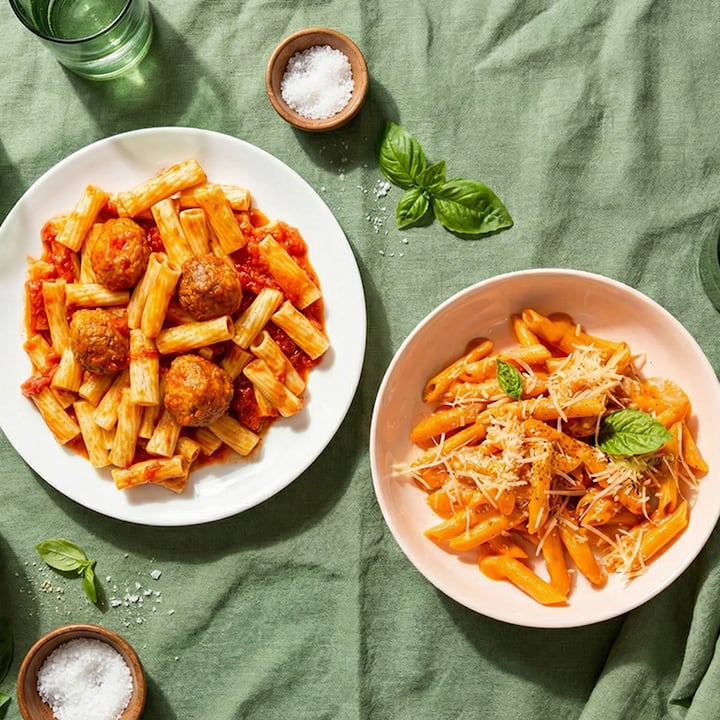 La comodidad acogedora te espera con el exclusivo Mom's Sunday Rigatoni de John DeLucie (salsa tradicional de domingo con albóndigas saladas, auténtica marinara y salchicha de cerdo italiana picante) y Penne con salsa rosa picante (una mezcla de salsa marinara roja y salsa alfredo blanca, pimienta roja picante triturada, queso Grana Padano salado y albahaca fresca). Incluye 2 de cada comida.