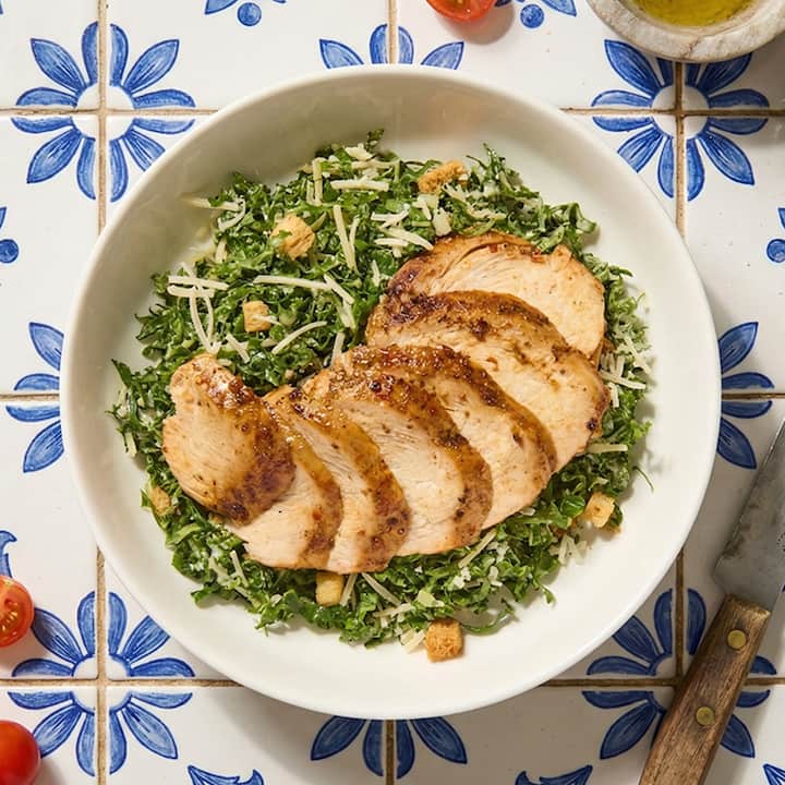 Un almuerzo o cena rápida, esta pechuga de pollo marinada a la parrilla se sirve sobre una ensalada César que agrada a la multitud con col rizada tierna en rodajas finas, picatostes italianos crujientes caseros y aderezo César cremoso. Incluye 1 comida por huésped.
