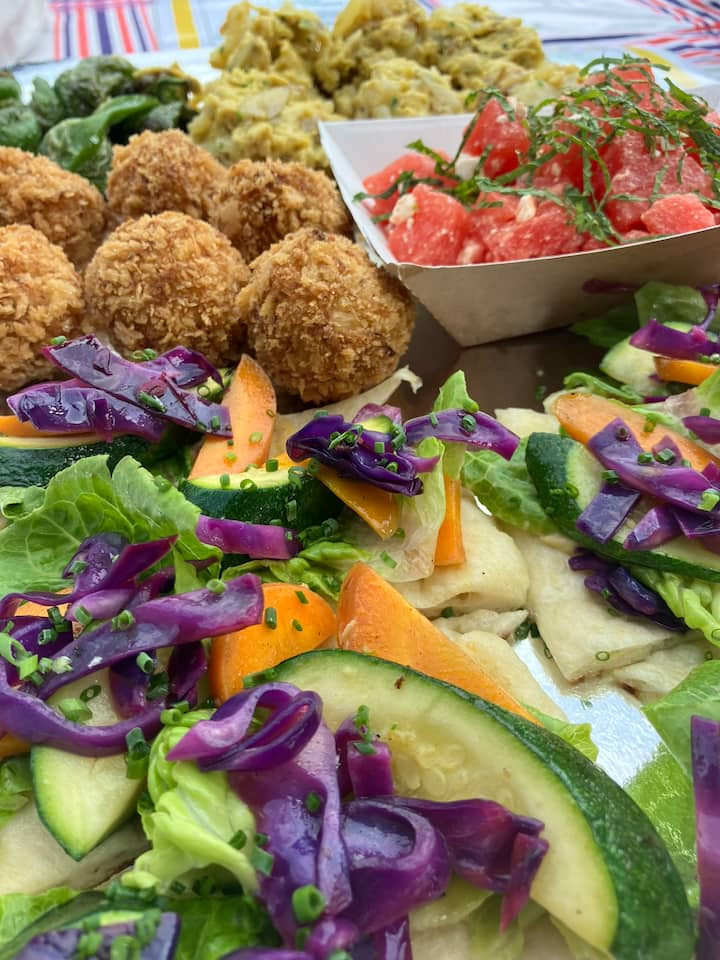 Buffet a base de bocadillos y pinchos, preparados con productos del mercado de productores.