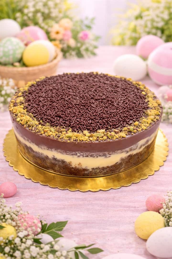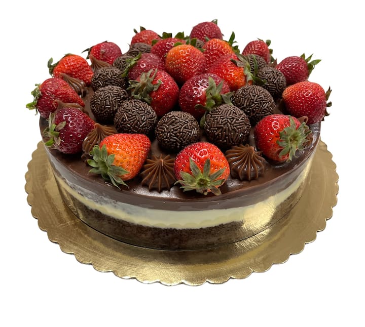 Pastel redondo de 6 pulgadas relleno de crema de pistacho, kadaif y fresas frescas. En la parte superior, nuestro delicioso brigadeiro de chocolate con leche.