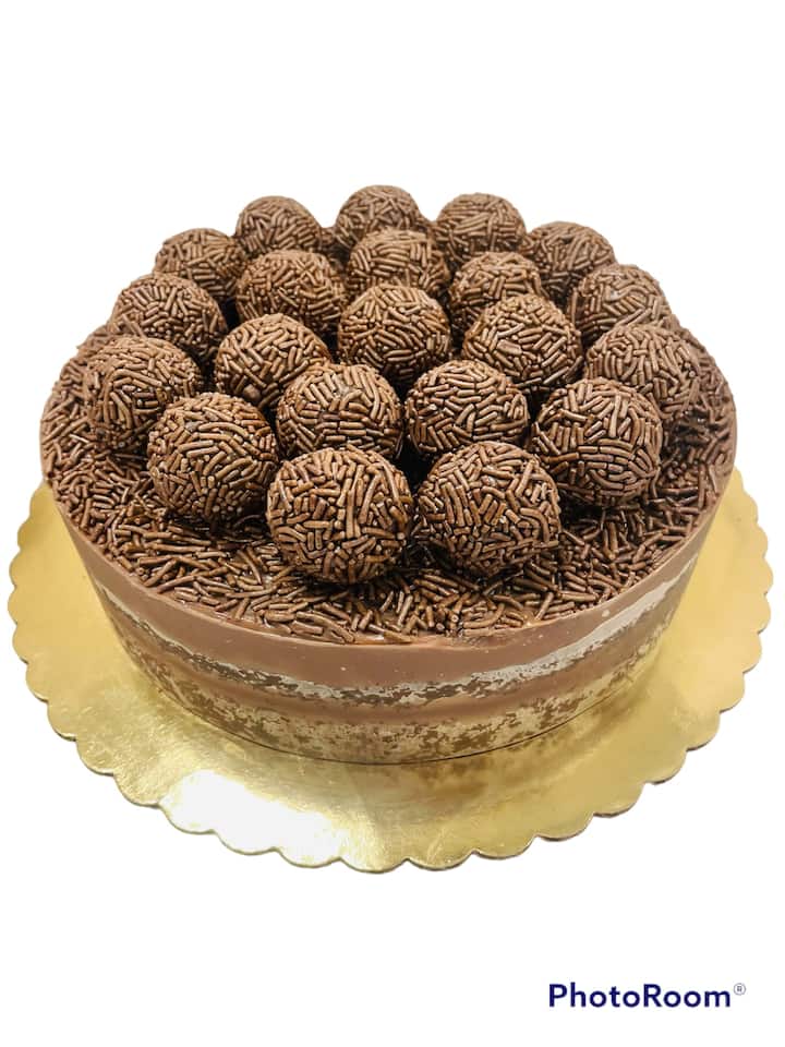 Disfruta de este popular pastel redondo de 8 pulgadas cubierto con trufas de brigadeiro de chocolate con leche.