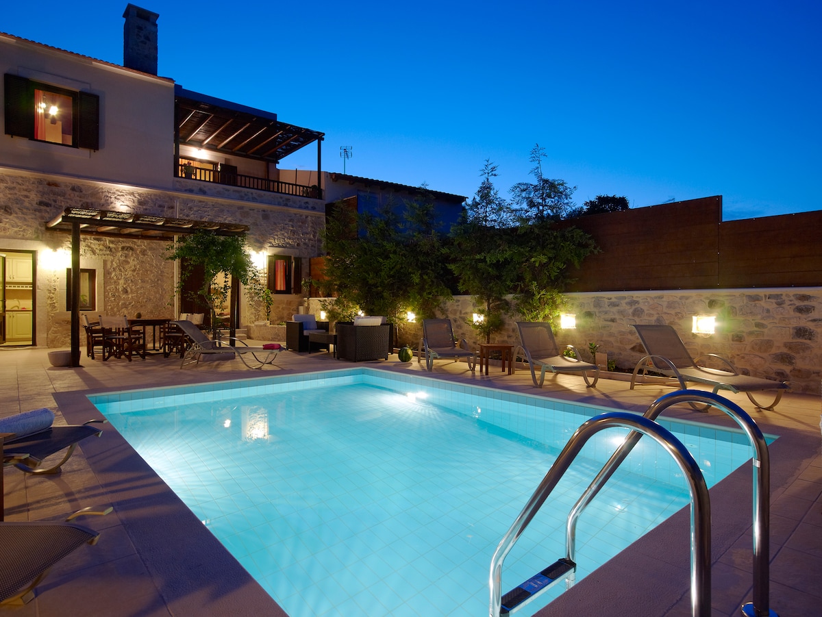 This charming stone villa(120 m2) offers a private pool and a beautifully designed outdoor area spanning 400 The outdoor space includes a well-maintained lawn, a barbecue with a unique wood-fired oven, a shaded seating area for 8 people, and sun loungers for your relaxation. The villa is situated in the village of Episkopi, where you'll find everything you need during your stay, including restaurants, taverns, and mini markets. Located just 10 km from Karterou Beach
