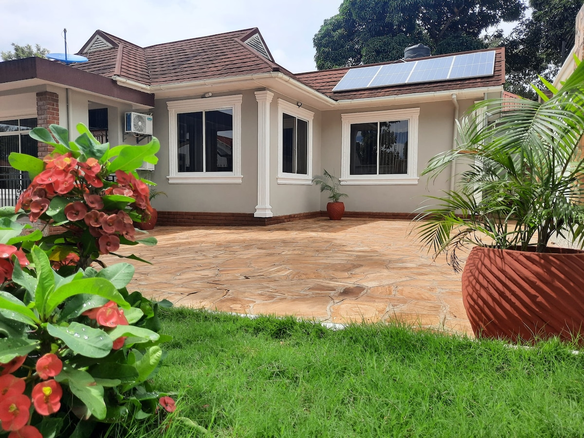 Una casa llena de paz en un barrio tranquilo. Complejo vallado seguro con guardia de seguridad, aparcamiento gratuito en el complejo. Porche cubierto para disfrutar de los jardines y el agradable clima. Planta baja: dos dormitorios independientes, sala de estar, cocina con utensilios para cocinar y nevera, tienda y baño público. En el primer piso hay dos habitaciones adicionales y un gran espacio abierto. Fácil acceso al transporte público. Bonitas vistas al monte Kilimanjaro.