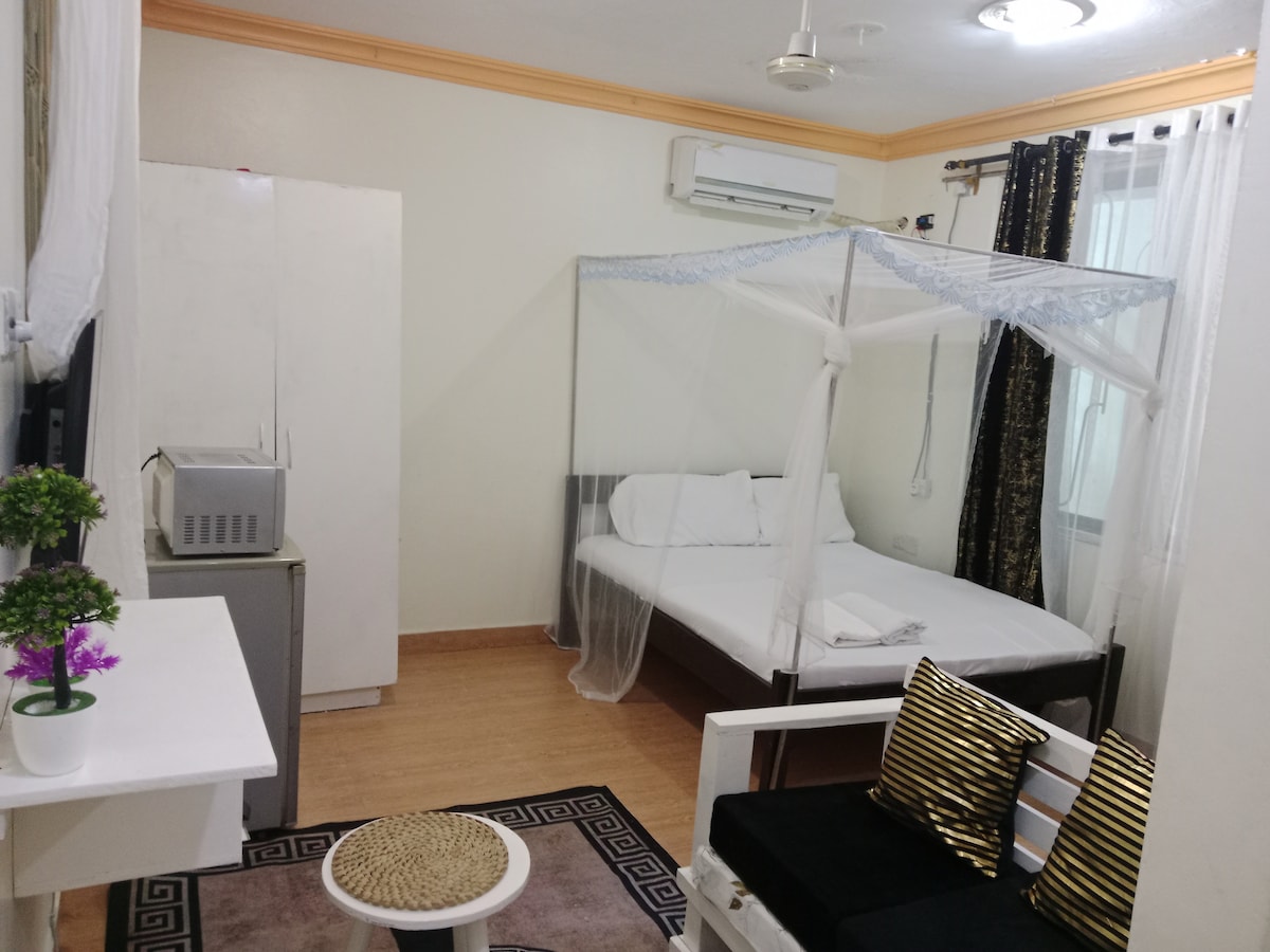 Our 1-bedroom apartment is located in Shanzu opposite the world renowned Serena Beach Hotel &Pride Inn Paradise Hotel. Easy 5 mins walk to the beach & both hotels. 20 minutes away from the main shopping center Nyali city mall, 10 mins away from world famous HALLER NATURE PARK, managed by SUPERHOSTS, ideal for BUSINESS/ HOLIDAY travelers. Located in a SAFE gated community, SELF-CHECK IN, WIFI, comfortable mattress, kitchen, airy living room, private bathroom,