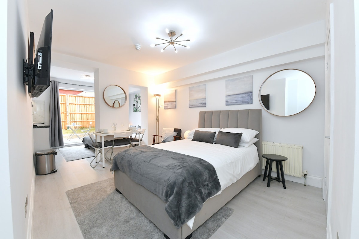 Departamento de un dormitorio cerca del centro comercial Westfield en el vibrante oeste de Londres. Perfecto para 2–4 huéspedes, ofrece una cama tamaño king en el dormitorio y un sofá cama en la sala de estar, ideal para parejas, familias o amigos. El apartamento incluye una cocina privada totalmente equipada y un acogedor patio trasero privado. A solo 4 minutos a pie de las principales conexiones de transporte: Shepherd's Bush (Central Line y Overground), Shepherd's Bush Market, White City y Wood Lane (Hammersmith & City and Circle Lines).