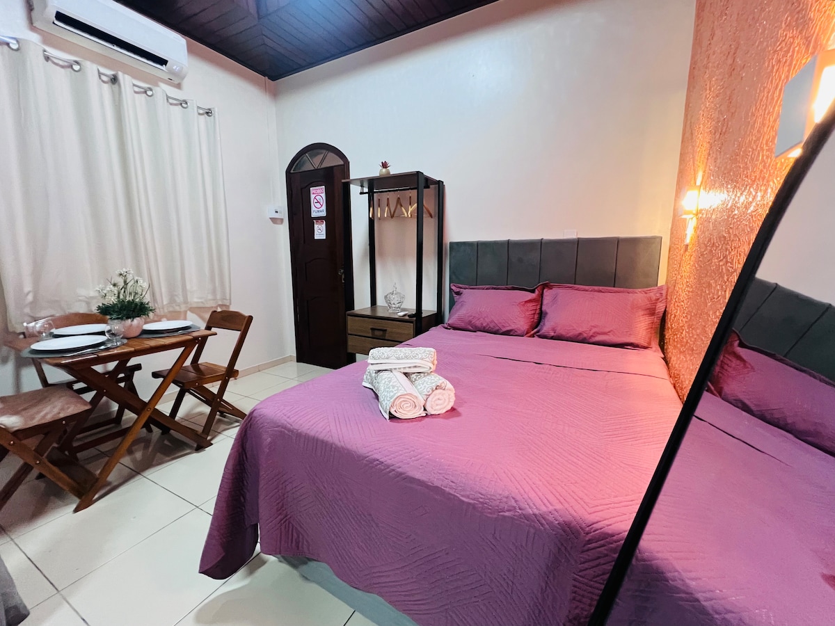 Projetamos cada detalhe para o seu bem-estar: Cozinha Completa: Geladeira Micro-ondas Todos os utensílios, talheres e panelas necessários para preparar suas refeições. Filtro de Água (Praticidade e saúde garantidas!) Conforto Garantido: Cama confortável e de alta qualidade. Toalhas e roupas de cama limpas e macias. TV para seus momentos de descanso. Ar-condicionado. Bem localizado, ideal para executivos, participantes da COP30 e viajantes.