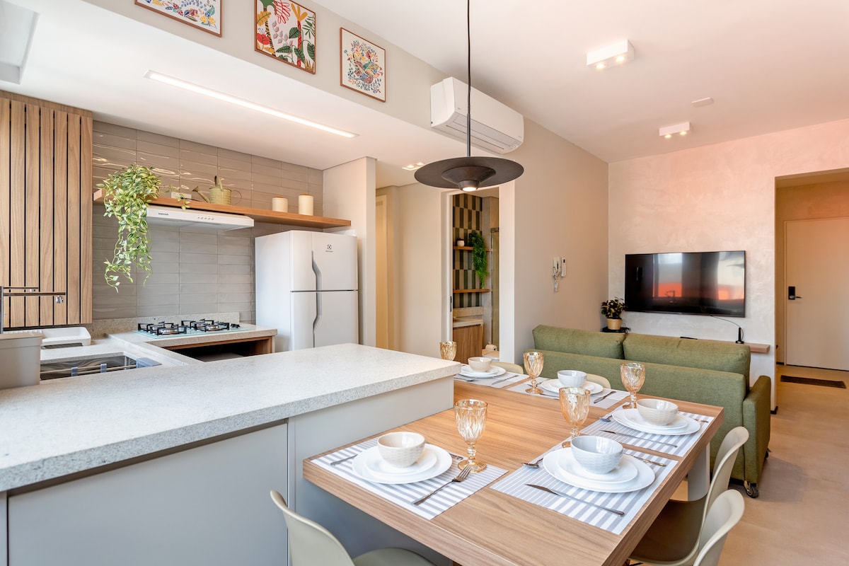 Bienvenido. Estamos privilegiadamente ubicados frente al centro comercial Curitiba, excelente ubicación cerca de todo, bares, restaurantes, lugares de interés, entre otros. Ideal para ti, tanto si vienes de viaje como por trabajo. Pensando en tu comodidad, tenemos una televisión inteligente, wifi, aire acondicionado, una cocina completa y una opción de aparcamiento (adjunta al edificio). El edificio cuenta con piscina climatizada (debes presentar un certificado médico), sauna, gimnasio, ludoteca y lavandería. Todo lo que necesitas.