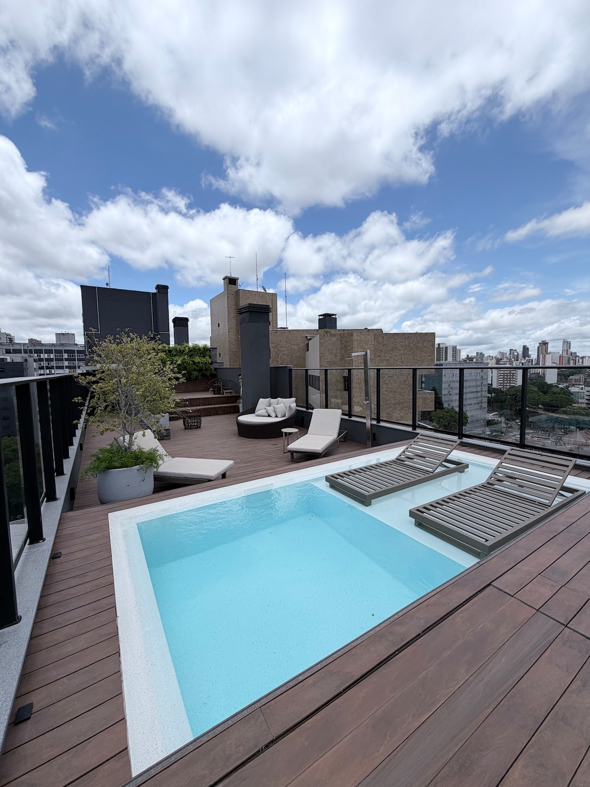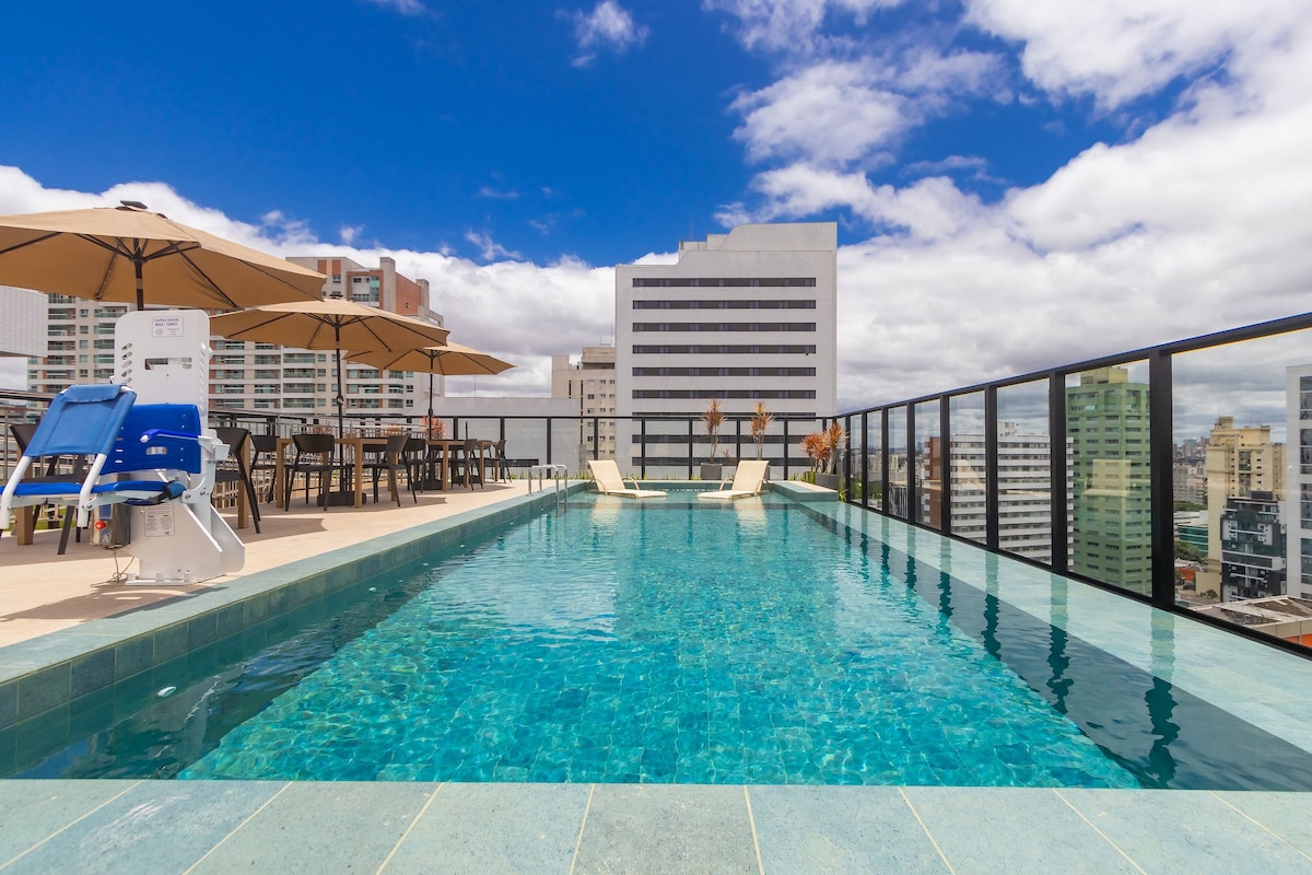Estudio de 34 m2, acogedor, totalmente equipado para tu comodidad. Situado en una región noble de Curitiba, rodeado de tiendas y restaurantes. El edificio ofrece una zona común completa con piscina infinita, jacuzzi, bar en la piscina, espacio gourmet, gimnasio, chimenea y lavandería. Junto al Hospital de la Cruz Roja, el patio comercial Batel, el Festival y el Hospital de Olhos do Paraná