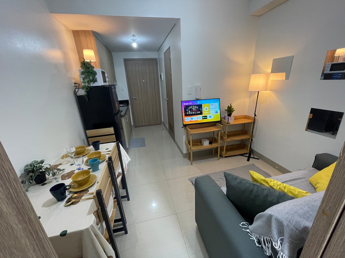 Bienvenido a nuestra unidad de 1 dormitorio de diseño minimalista con una increíble vista a la piscina. Relájate en la espaciosa sala de estar con nuestro televisor inteligente, cocina tus comidas en nuestra cocina totalmente equipada para cenar o simplemente disfruta de momentos mirando por el balcón. Pero lo más importante es que duermas profundamente en nuestras cómodas camas. Situado a poca distancia a pie de Ikea, del Centro de Convenciones SMX, del MOA Arena y de los alrededores del centro comercial Mall of Asia. Disfruta de los restaurantes, cafeterías y tiendas de comestibles cercanos, justo a las afueras del apartamento.
