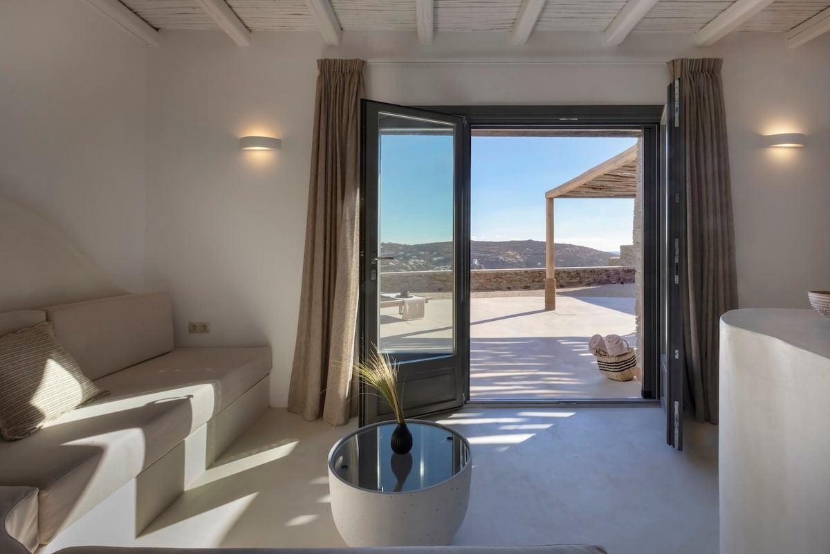 Experimenta la magia de las Cícladas en nuestro encantador apartamento frente al mar, con vistas panorámicas a la pintoresca bahía de Cheronissos. Con capacidad para un máximo de 6 huéspedes, nuestro lujoso refugio ofrece dos elegantes dormitorios dobles, una acogedora sala de estar de concepto abierto, una cocina totalmente equipada y un elegante baño. Relájate en el encantador balcón mientras disfrutas de las impresionantes vistas de las aguas cristalinas y los encantadores barcos de pescadores: ¡te espera una experiencia verdaderamente serena y auténtica en la isla griega!
