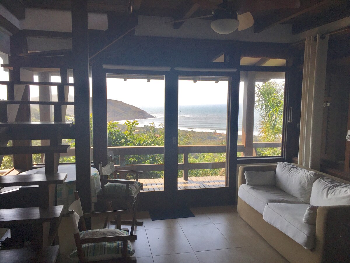Amplia casa a 400 mts. de la playa y a 100 mts. del centrinho. Capacidad máxima para 6 personas. Acogedora y confortable. Excelente vista a la Laguna de Ibiraquera en el deck. Mirador en el punto más alto del morro con vistas al mar. Dormitorio principal en suite con cama matrimonial (sin A/C) , 1 dormitorio con 5 camas individuales y baño externo. Entrepiso con 1 cama doble. Living y cocina. Ducha exterior y parrilla. Deck externo. Estacionamiento privado para dos autos. Wi-Fi bueno y seguro.