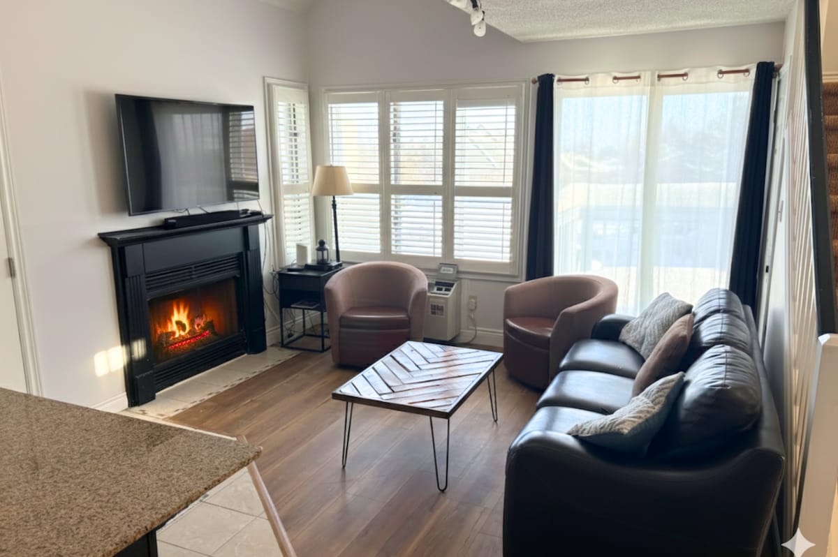 Este hermoso apartamento de dos dormitorios y dos niveles se encuentra en la pintoresca Collingwood/Blue Mountains, Ontario. Disfruta de un espacio familiar con terraza privada, chimenea eléctrica para acurrucarte cada noche e instalaciones que incluyen piscina de temporada, jacuzzi, canchas de tenis y servicio de transporte bajo demanda, todo a solo unos pasos del telesilla y las pistas de esquí. ¡A pocos minutos del spa escandinavo y de la playa de Northwinds! ¡Internet de alta velocidad incluido para relajarte en tu tiempo libre!