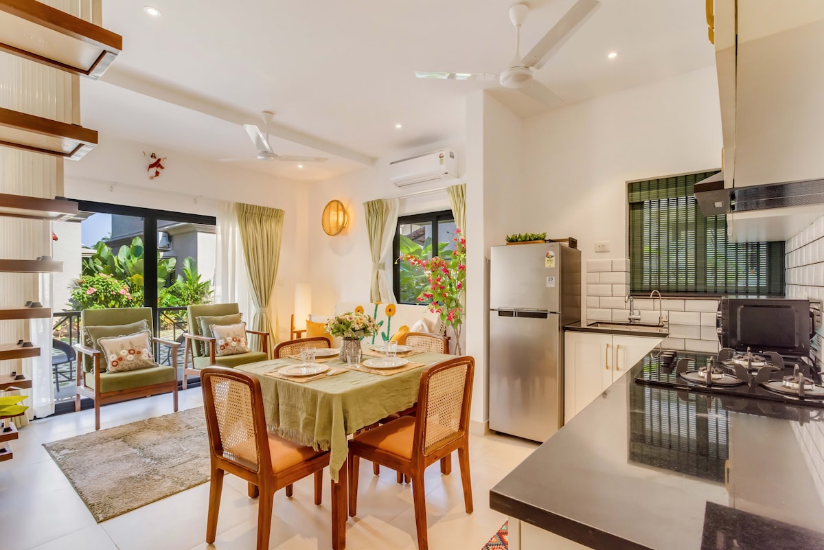SanKara 1BHK is a luxury retreat. a gated complex with just mins from Uddo Beach, Assagao, Morjim, Ashvem, Arambol, and the best places like Thalassa, Summer House Goa & Kiki by the Sea. Enjoy a spacious comfortable bedroom, fully equipped kitchen, luxury modern bathroom, Insta- worthy cozy living area with a smart TV, study nook, and a balcony with green views. With wooden flooring and homely vibes & insta-worthy corners, perfect for couples, solo travelers & digital nomads!