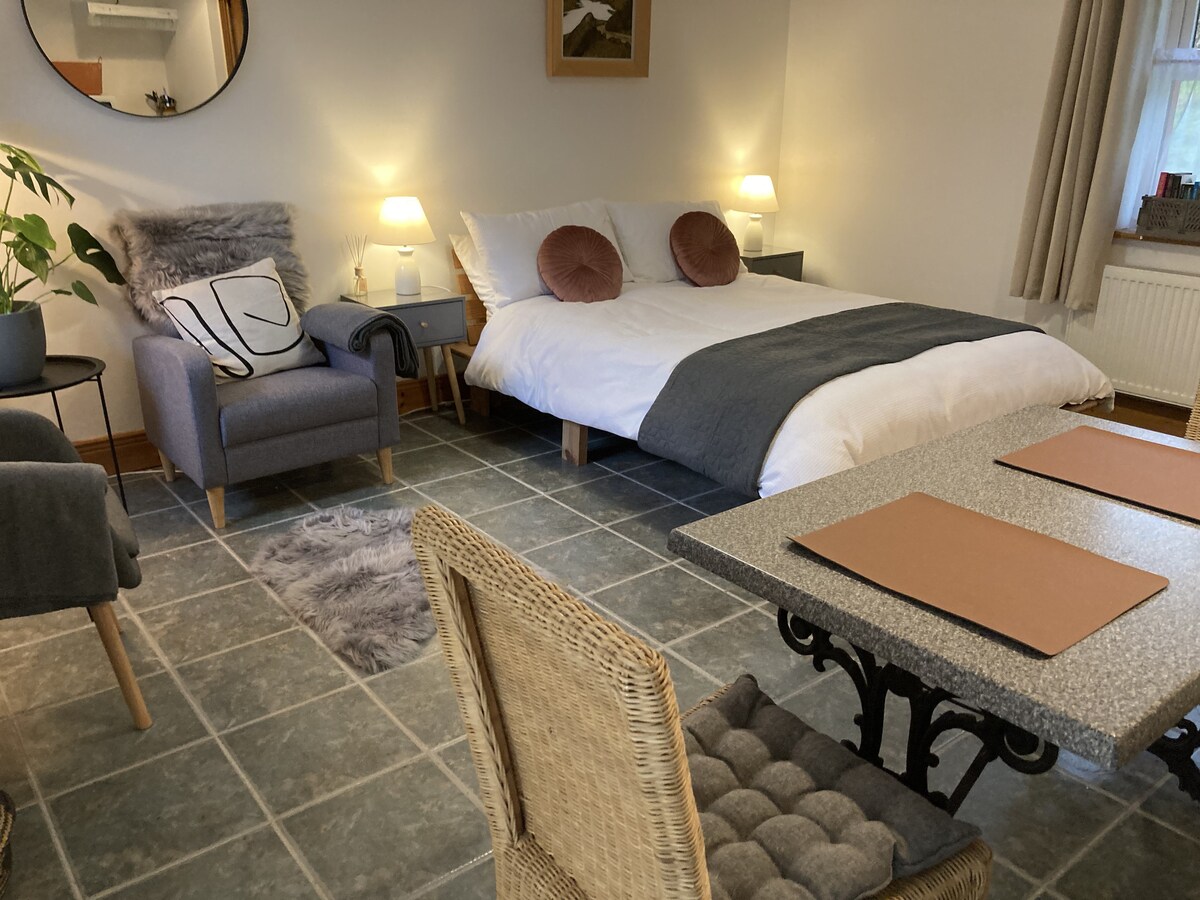 Acogedor chalet con un dormitorio familiar grande en la planta superior (camas dobles e individuales). Cuna/trona y puerta de escalera disponibles. La planta baja tiene una cocina espaciosa y una sala de estar con una estufa de leña, TV y wifi, también un aseo/ducha. Es una unidad separada detrás de nuestra casa con mucha privacidad. Los huéspedes tienen una zona de estar privada al aire libre con acceso a un gran césped.