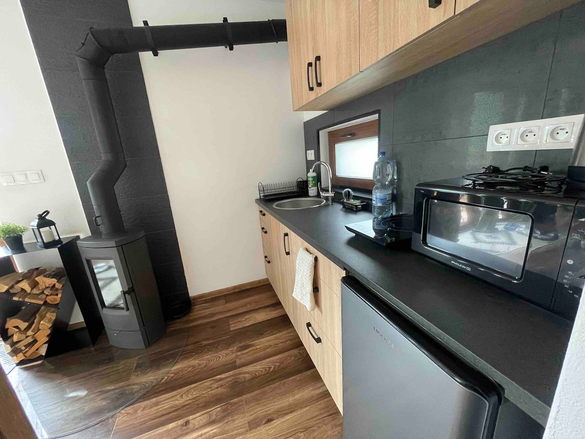 Mini casa en el jardín junto a la casa familiar de los propietarios en el centro más amplio de Banská Bystrica, a 1 km del centro. Superficie de la casa 32 m2 !!! + terraza rodeada de vegetación y con vistas a la montaña Urpín de Banská Bystrica. Dormitorio con cama de matrimonio, baño con ducha, cocina equipada con zona de estar, con posibilidad de desplegar el sofá como cama supletoria - para 2 personas. Terraza exterior con asientos. Se admiten mascotas bajo acuerdo :-) Adecuado para bebés, cuna disponible.