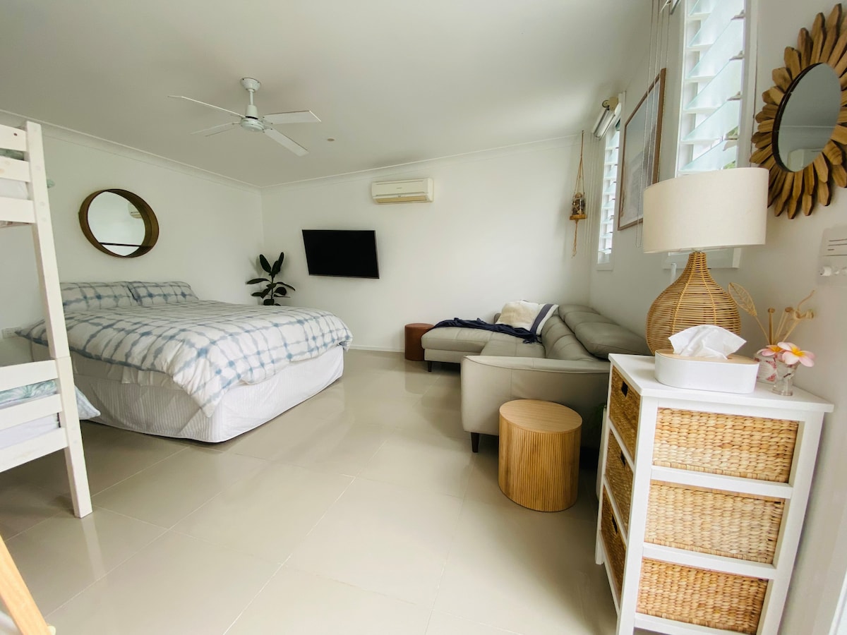 Si buscas la escapada perfecta para 2 personas, no busques más. Estaremos encantados de recibirte en nuestro moderno y privado estudio independiente que se encuentra en la planta baja de nuestra casa, pero completamente separado de nuestra casa. Estamos perfectamente ubicados, con Elizabeth Beach y Wallis Lake a poca distancia a pie. Las playas de Shelly, Boomerang y Blueys están a solo 2 minutos en coche por la carretera.