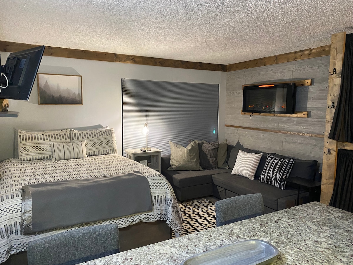 El apartamento tipo estudio con espacio de trabajo actualizado está situado en Silver Creek Resort, en el segundo piso, que también es el primer piso de las habitaciones. ¡No hay largos viajes en ascensor! ¡Aire acondicionado portátil incluido! Este alojamiento es perfecto para parejas, pero ofrecemos espacio para tres huéspedes. Información completa: el futón NO es muy cómodo, pero puede alojar a un tercer huésped :) Recibirás acceso con tarjeta llave a una sauna, jacuzzis y piscina climatizada interior/exterior. Televisor inteligente Roku de 58 pulgadas con cable básico. Aparcamiento incluido.