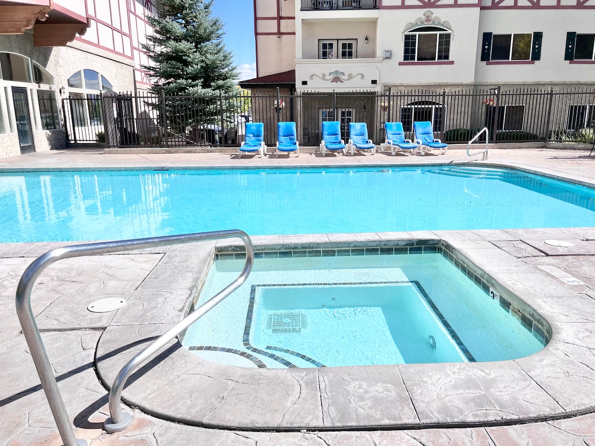 Welcome to the Villas at Zermatt Resort, a Swiss-inspired retreat in Midway, Utah, just minutes from Park City, Deer Valley, and Sundance. Enjoy year-round amenities like indoor/outdoor pools and hot tubs, plus nearby hiking, biking, golfing, skiing, water sports, and winter ice fishing. This newly remodeled Double Queen Suite sleeps 4 with two queen beds, a private bath with tub/shower, flat-screen TV, blackout curtains, and a work desk. Easy keyless check-in and stocked essentials included!