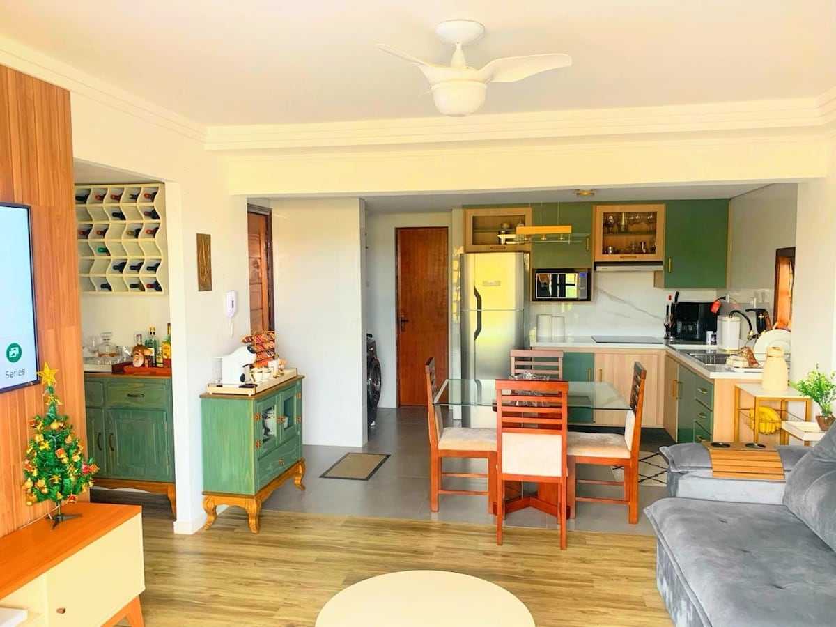Increíble apartamento en un edificio nuevo, con una decoración sofisticada y funcional. Nuestra casa en invierno que ofrecemos a los huéspedes en verano. Aire acondicionado split. Wifi de 240 Mb. TV de 60" en la sala de estar y de 35" en las habitaciones. Cocina, horno eléctrico, microondas. Nevera y congelador. Cocina y despensa totalmente equipadas. Lavavajillas, lavadora/secadora. 1 suite con cama Queen y un dormitorio con baño y dos camas box. Balcón gourmet cerrado con vidrio, con parrilla y nevera extra para bebidas.