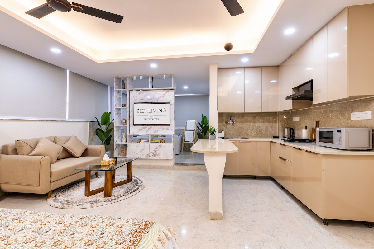 Gurgaon's favourite couple retreat at Sapphire 83. Order custom cakes, flower bouquets, room décor and photography directly through our guest portal. Enjoy stylish living area with books & games, fully loaded kitchen, beautiful bedroom with TV/OTT. Work or relax with a dedicated workstation & 200+ Mbps WiFi. Step onto open-view balcony for skyline views. Strategic location near NH48, Dwarka Exp, SPR, Amex, Air India, TCS. Inox, pubs, restaurants and mall level convenience are steps away.