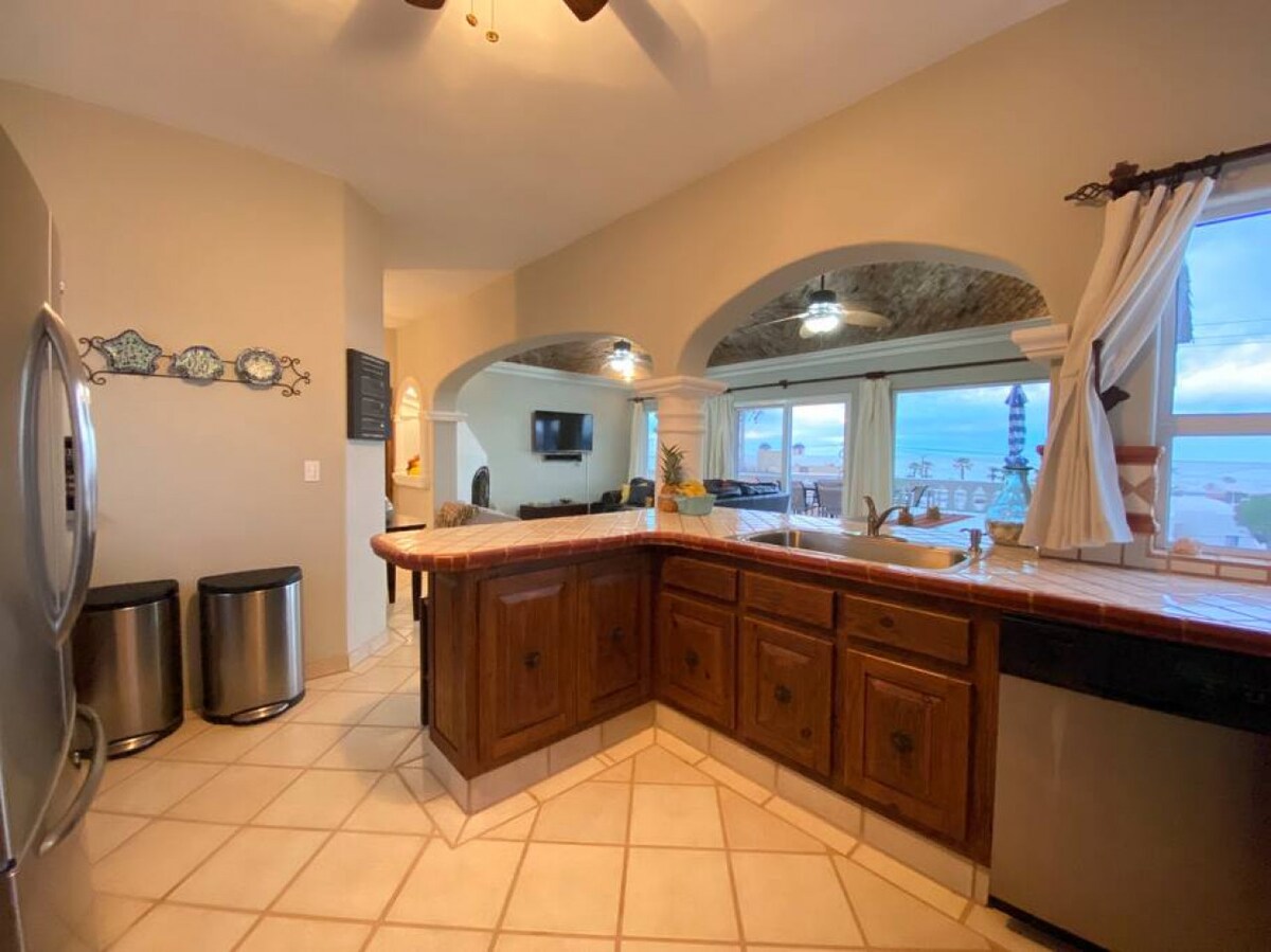 BELLEZA TRANQUILA FRENTE A LA PLAYA... ¿Buscas unas vacaciones tranquilas, relajantes o románticas lejos de las multitudes? Ubicado en la playa más prístina de toda la comunidad de Rocky Point. Si practicar surf de remo, esnórquel, buscar objetos en la playa o ver el amanecer o la puesta de sol desde tu propio patio privado es tu elección, entonces te sentirás como en casa. Comunidad cerrada con seguridad las 24 horas, 7 días a la semana. Servicios completos, Direct TV, wifi, ropa de cama limpia y todo lo que necesites.
