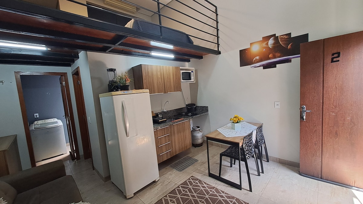 Lindo Studio, todo mobiliado, cheirando novo, pronto para você ter noites tranquilas e agradáveis. Tudo que você pode precisar você encontra aqui, smart Tv na sala, fogão, geladeira, maquina de lavar, sofá, armários em todos os cômodos, banheiro completo, cama de casal grande, utensílios de cozinha, ar-condicionado em todos os cômodos.