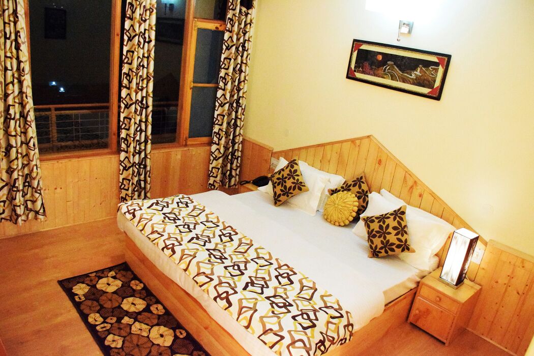 La casa está cerca de Manali, frente a un paisaje montañoso neblinoso. Los interiores están elegantemente hechos, con una sala de estar con paneles de madera preominada y amueblada con cómodos sofás tapizados cubiertos de paño de crotchet, un café cubierto de vidrio. También se proporciona un televisor para entretenimiento y ocio. La habitación que se ofrece está amueblada con una cómoda cama doble escondida en edredones cálidos, un armario con espejos y una cómoda para vestirse.