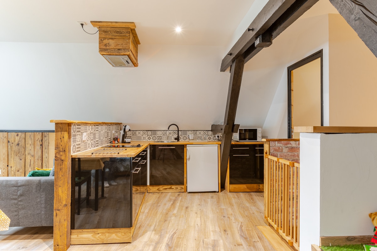 Un granero acogedor con una zona de hidromasaje privada para pasar un momento inolvidable en pareja. Podrá disfrutar de una gran bañera de hidromasaje para 2 personas y una magnífica sauna solo para usted. Una enorme cama de 200x200 está lista a su llegada. En el exterior, dispondrá de una pequeña terraza y una plaza de aparcamiento delante de la casa.