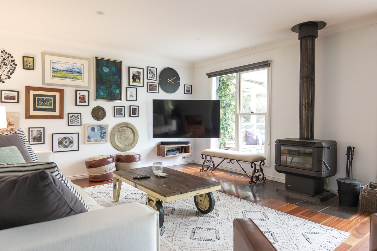 Una propiedad limpia, elegante y espaciosa que admite mascotas ubicada a solo 5 minutos en coche de la Princess Highway en una pintoresca propiedad de 7 acres de eucaliptos azules. La casa de campo ofrece mucho espacio para la familia con una sala de estar de planta abierta, comedor y salón con una acogedora chimenea de leña y ventiladores de techo. Disfruta sentado en la zona de la terraza privada contemplando la serenidad, disfrutando de la vida de las aves locales o relajándote alrededor de la hoguera.