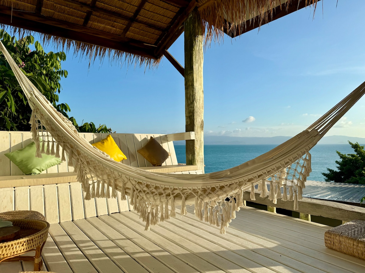 Glamping tropical junto al 🌴 acantilado con vistas al mar y red🐬
