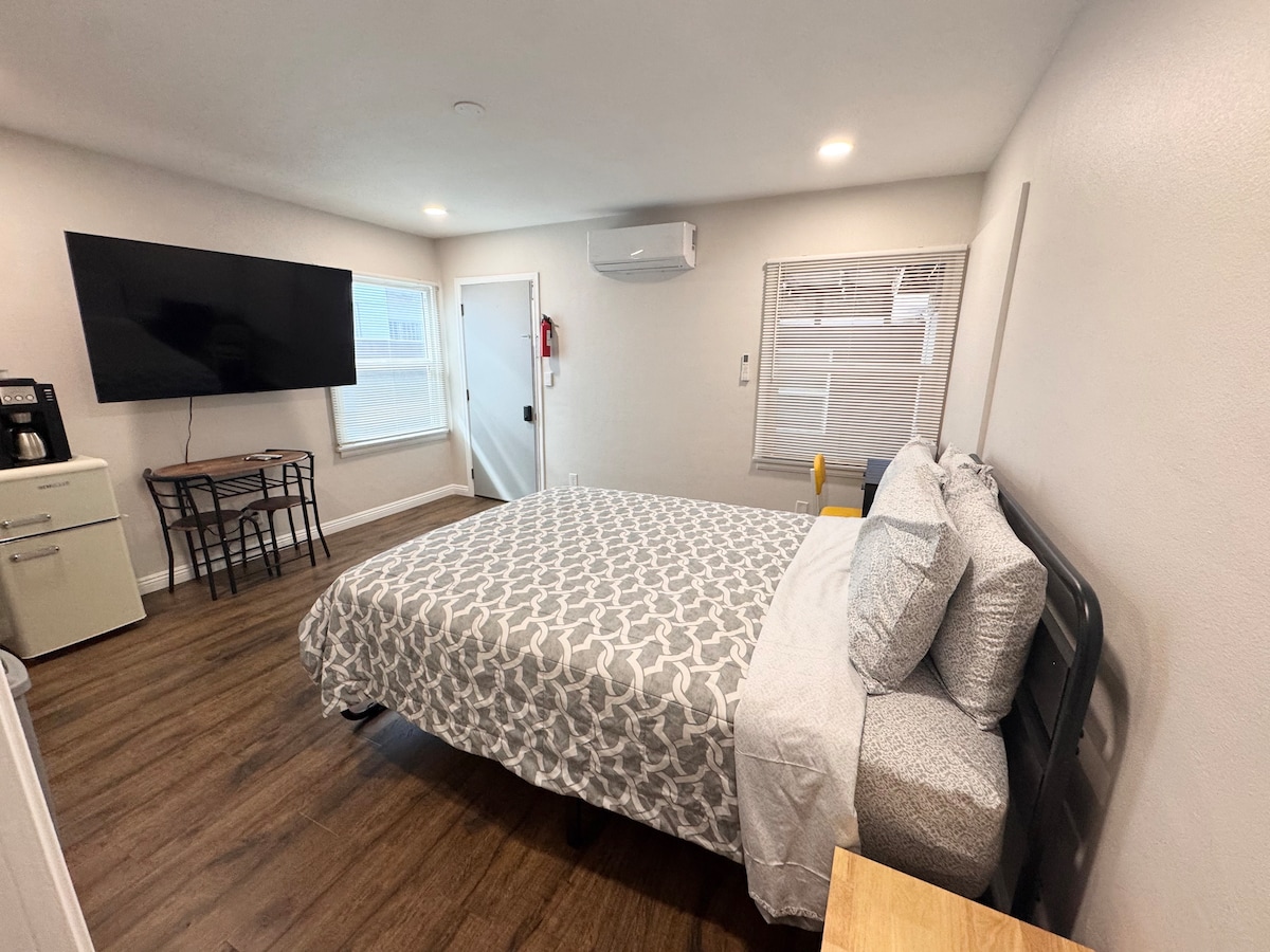 Welcome to your stylish and convenient studio apartment nestled in South El Monte This cozy space offers minimalistic living with a touch of comfort, perfect for those seeking a hassle-free lifestyle. Key Features: Kitchenette: Fully equipped with various appliances and some ingredients for simple meals. Bedroom Area: Private and inviting, with a queen-sized bed and nightstands for your convenience. Bathroom: Spacious and peaceful, packed with toiletries and an LED Mirror great for selfies