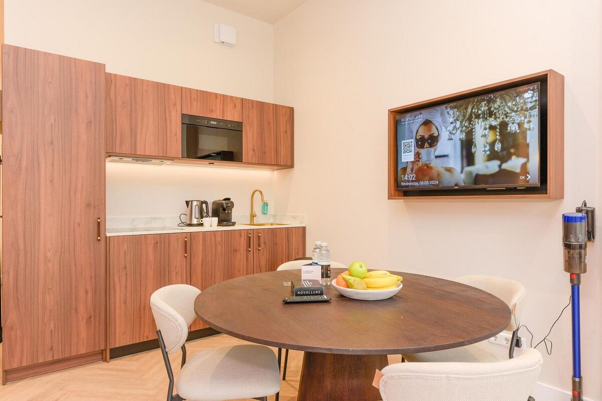 Cozy studio perfect for couples or business travellers. Sleeping and living area with queen bed. Fully equipped kitchenette with fridge, stovetop, microwave, dishwasher and Nespresso machine. Flat-screen TV, free Wi-Fi, and a workspace. Private bathroom with rain shower, hairdryer, and toiletries. The appartment has a climate control system.