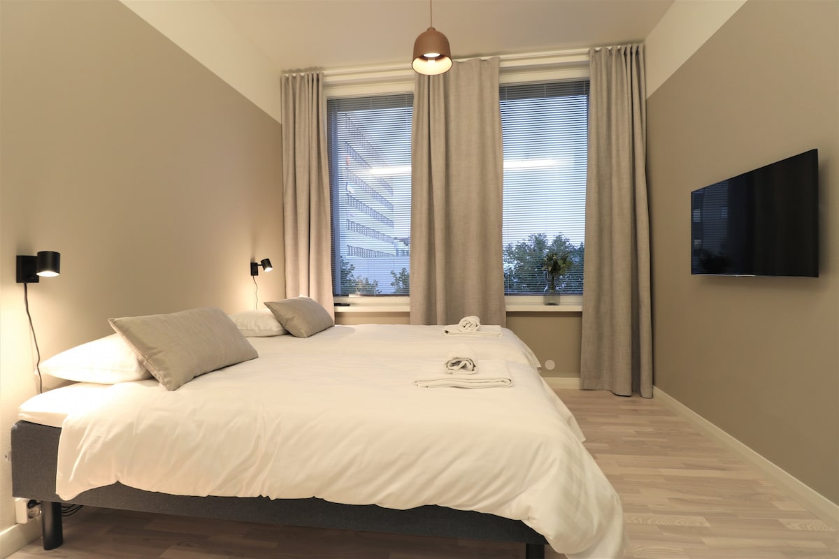 In this cozy studio you’ll find a convenient kitchenette that is equipped with a small stove-top, refrigerator, dishwasher, combination of microwave and oven, coffee machine, water kettle and tableware. For comfort, there is a stylish private bathroom and shower as well as a hairdryer. Relaxing nights are provided for by two single beds. There is a complimentary Wi-Fi connection as well as bed linen and towels.