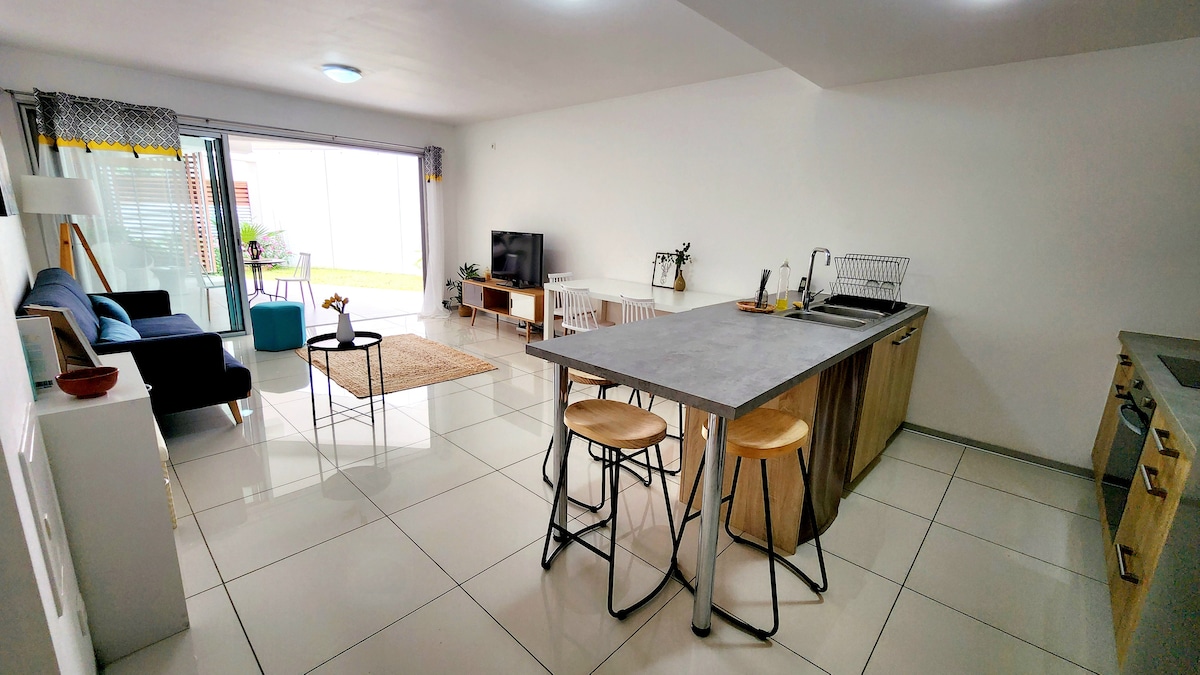 Gran bungalow independiente. Cerca de la villa de los propietarios, tiene una entrada independiente, un jardín y una terraza privados, una zona de barbacoa privada. Lavandería independiente con lavadora privada. Ubicación ideal, cerca de las playas de l'Anse VATA y de las rutas deportivas del paseo marítimo Pierre Vernier Panaderías y tienda de comestibles, así como una parada de autobús frente a la casa, centro médico cercano. 2 adultos o 1 adulto y 1 niño mayor de 2 años. Se habla inglés