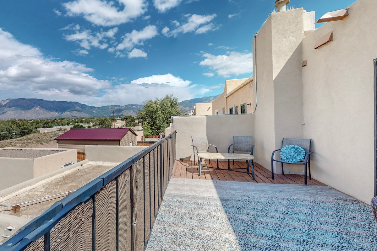 Esta casa adosada de estilo Santa Fe está bien equipada tanto para cocinar como para relajarse. La cocina y los baños han sido remodelados recientemente. El dormitorio principal tiene una cama Sleep Number, el segundo dormitorio tiene un nuevo colchón de felpa. ¡El espacio al aire libre tiene un entorno tranquilo con una chimenea de gas relajante y juegos para los niños! * 2025: recientemente agregado: ¡Aire refrigerado! > 4 entradas de 🎉 cortesía para el Sandia Tramway, ¡por un valor de 136 $! Solo tienes que avisar a tu anfitriona, Teresa, con 2-4 semanas de antelación. Las entradas son limitadas, no disponibles durante el ABQ Ballo