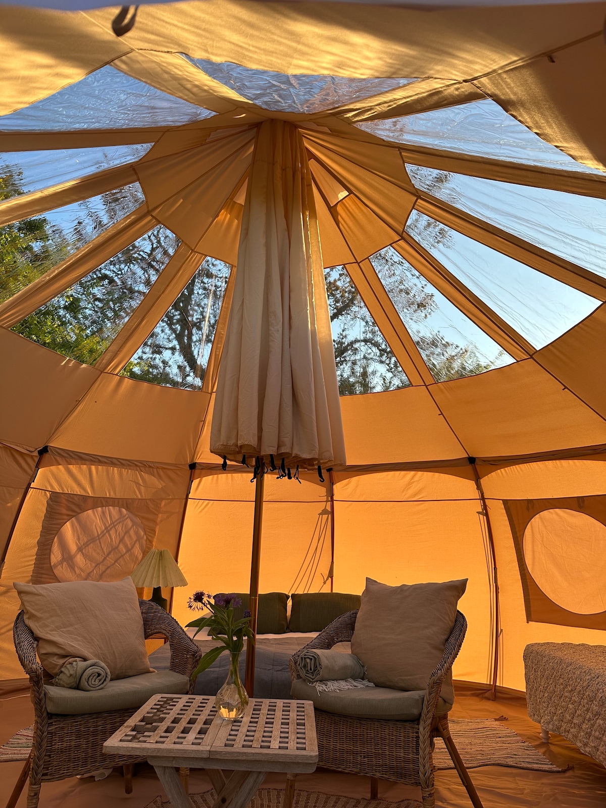 Lad dit indre ur-menneske og dit moderne jeg komme i kontakt med hinanden i en glamourøs og afslappende glampingoplevelse. Vi sørger for de mest nødvendige ting til camping, som madrasser, puder, dyner, båludstyr og indendørs teltovn som også kan bruges til madlavning ved dårligt vejr. Vi tilbyder også fri afbenyttelse af privat spa som står lige uden for ens telt.