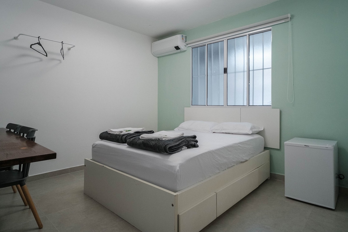 *** Alojamiento para 1 persona solamente *** Relájate en este espacio tranquilo y elegante. cama doble, aire acondicionado frío/calor y lavadora. - Internet Vivo Fibra (300Mb). - Cocina privada con refrigerador,estufa,microondas, cafetera Nespresso y utensilios domésticos sin escarcha. - mesa de oficina en casa. - TV Samsung Smart 4K - 43”. - Cambio de sábanas 1 vez a la semana. - área exterior compartida con otro huésped ( gimnasio y jardín )