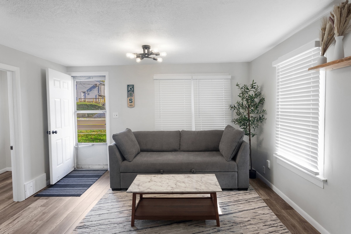Relájate y desconecta en este alojamiento tranquilo y elegante. Este apartamento de 1 dormitorio está situado en un edificio de mediados de siglo en una zona urbana. Ubicado a pocos minutos del campus de MSU y a poca distancia a pie del centro de Lansing. El apartamento tiene todo lo que necesitas para una estancia corta o larga. Ten en cuenta que la segunda cama es un sofá cama. No todo el mundo los encuentra cómodos.