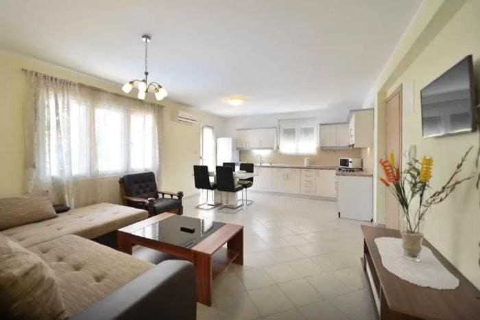 The modernly furnished apartment has a room with a separate air conditioning, TV and modern lighting. The kitchen is equipped with dishwasher, ceramic plate, microwave and all the equipment. The living room has sofas for a third person and its tv and air conditioning. The apartment has a beautiful terrace overlooking the sea, ancient Salon and Split. Guests can use our swimming pool and barbecue in the garden.