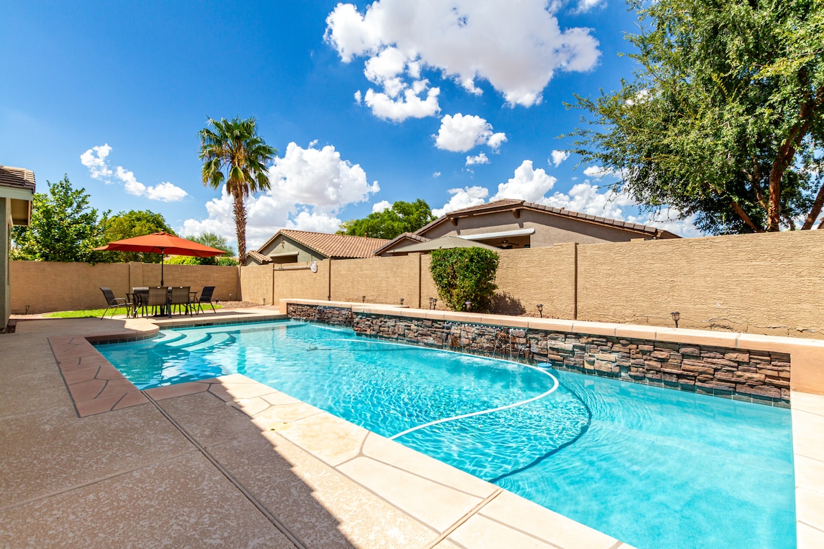 Maravilloso, cómodo, espacioso, más de 2300 pies cuadrados. Casa unifamiliar totalmente amueblada. ¡Mucho espacio para pasear con sala de estar y sala familiar con chimenea de gas! Disfruta del sol de Arizona o de las hermosas noches estrelladas en este patio trasero privado estilo resort. con patio cubierto, piscina de juegos y mesa de fuego de gas. También incluye patio vallado para tus mascotas. ¡Se admiten mascotas! 1 estacionamiento en garaje. ¡Gran barrio! Cerca de excelentes restaurantes y tiendas y acceso a la autopista. AZ TPT#21500053