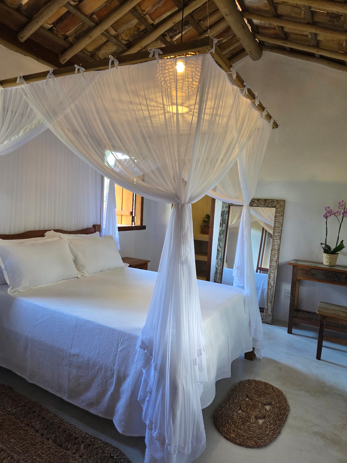 Amplia suite, cómoda y muy bien ventilada, con vistas al bosque nativo, a 10 minutos a pie de la playa de Pescadores y a 15 del centro de Arraial d Ajuda. La suite tiene ventilador de techo, minibar, cafetera, TV y artículos de tocador. Nuestro patio trasero está rodeado de bosque nativo y con muchos animales sueltos que hacen felices a los niños y a muchos adultos. Nuestra famosa Rua do Mucugê está a solo 900 metros, a 15 minutos a pie.