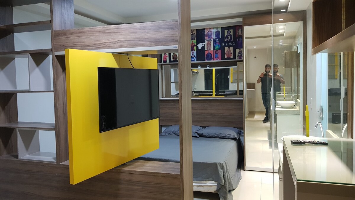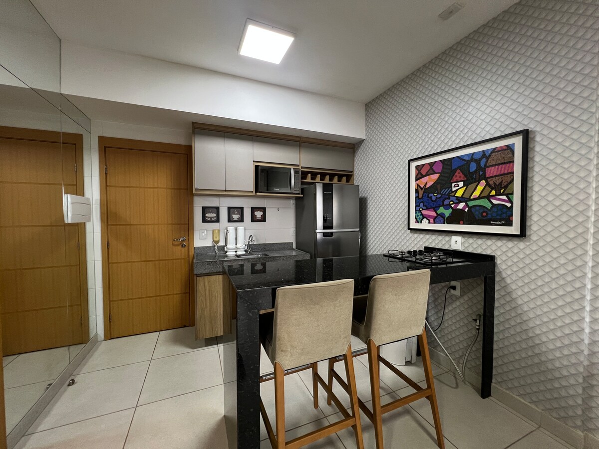 Perfecto para parejas y viajeros, este moderno loft en un edificio nuevo cuenta con: ✅ ** Cama TAMAÑO KING ** (sábanas de primera calidad) ✅ **Piscina, gimnasio, zona de barbacoa y terraza panorámica ** ✅ ** Wifi ultrarrápido ** (fibra óptica) y **SmartTV con Netflix** ✅ **Cocina totalmente equipada**, lavadora y aire acondicionado ✅ ** Artículos de aseo gratuitos** y artículos básicos proporcionados Ubicación tranquila en **Blue Building (Rua dos Caripunas 1016)** – ¡ideal para relajarse o trabajar a distancia!