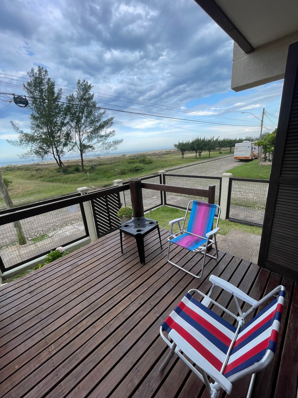 Casa pé na areia com deck privativo com escada a beira mar, sacada ampla inferior e superior, deck com bancos, espreguicadeiras e rede. Forno e fogão a lenha, além de churrasqueira tipo parrijeira e lareira. Cozinha completa. Peças amplas e arejadas. Colchões com capas higienizáveis. Um paraíso para festejar com amigos e familia. Tem pranchas, morey e bicicleta. A noite do deck superior se pode ver a iluminação do farol do Chuí, que divide Brasil e Uruguai.