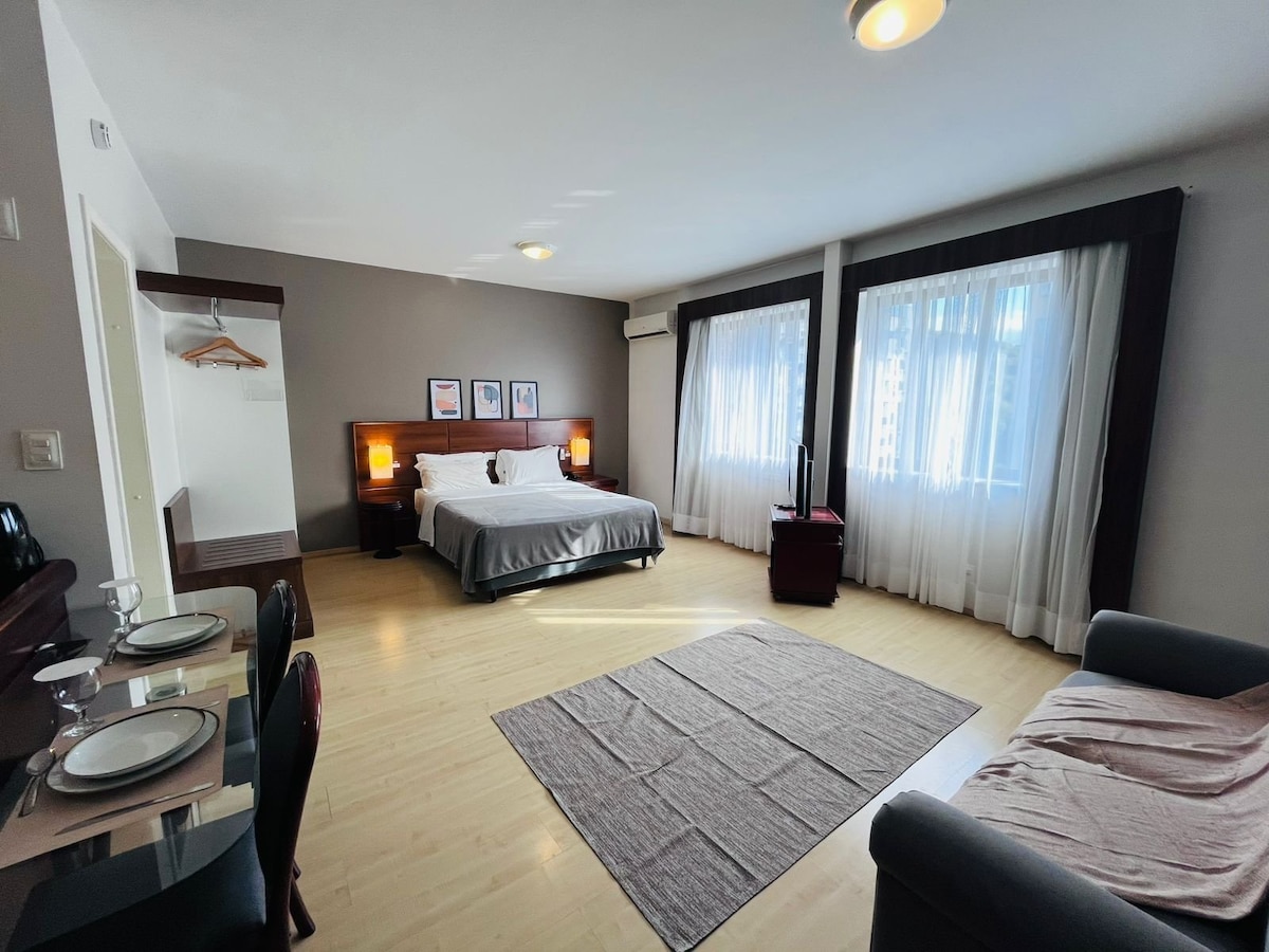 Disfrute de una excelente ubicación. Excelentes restaurantes cerca. cama matrimonial Limpieza diaria Televisión inteligente Wi-Fi rápido Herramientas básicas de cocina. Pava Sandwichera Estufa Televisión inteligente Wi-Fi rápido Recepción 24hs Piscina Gimnasia Sauna El personal es super amable y educado. ¡Lo disfrutarás absolutamente!