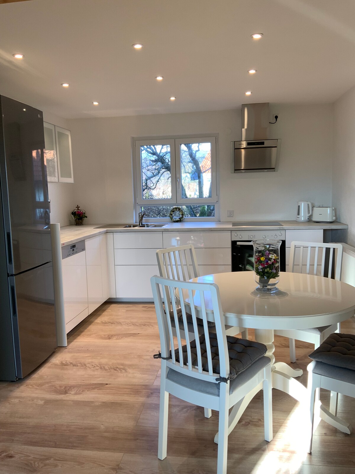 * Free parking lot, garden pavilion and balcony * Living room with fireplace, reading corner, hanging chair and 4k TV * Family-friendly - high chair, travel cot, children's cutlery * New fully equipped kitchen - coffee, spices and snacks * 85 square meter maisonette apartment on the 1st floor * Workstation with office chair, external monitor and Lan connection * Air conditioning for dining area