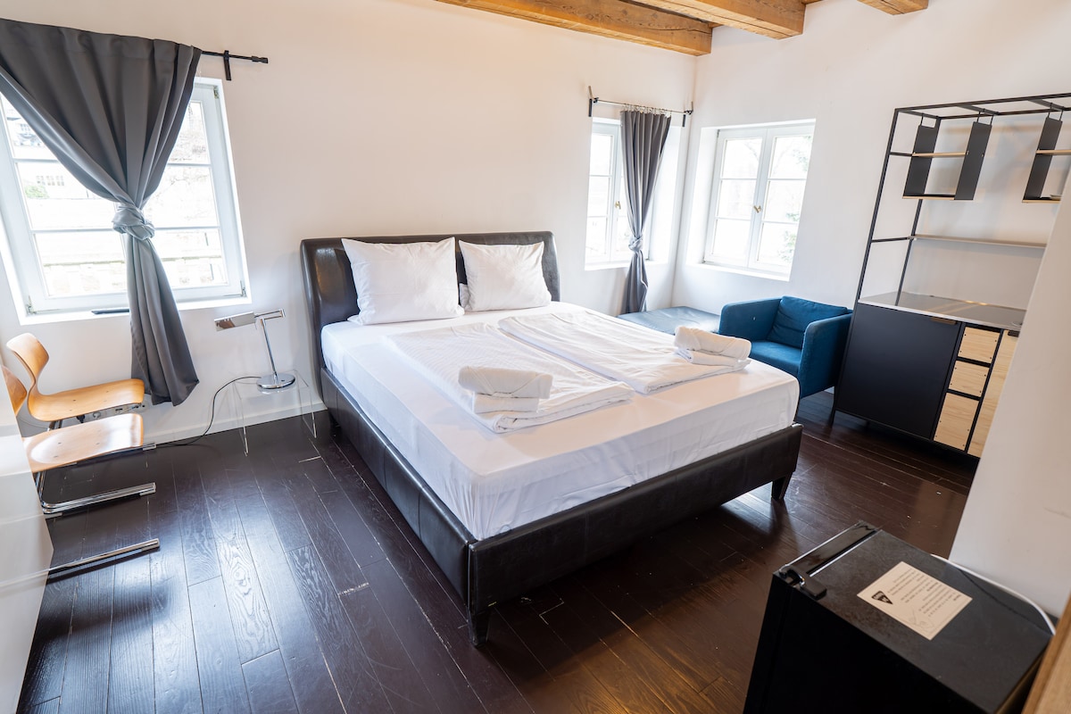 Forma parte del Conjunto de Parques y Castillos de Potsdam y Berlín de la UNESCO, este llamativo granero histórico hoy convertido, ofrece cuatro dormitorios, sin pretensiones pero muy refinados y fieles a su pasado. Esta habitación 1 con su gran cama pintada a mano y azul y alfombras de colores completan la calidez de los pisos de terracota natural pavimentada, sus paredes blancas y su techo de madera. Su nombre es "Stone Blue Room". Un increíble ático espacioso le ofrece descansar en las camas de día, una zona de comedor y una cocina.