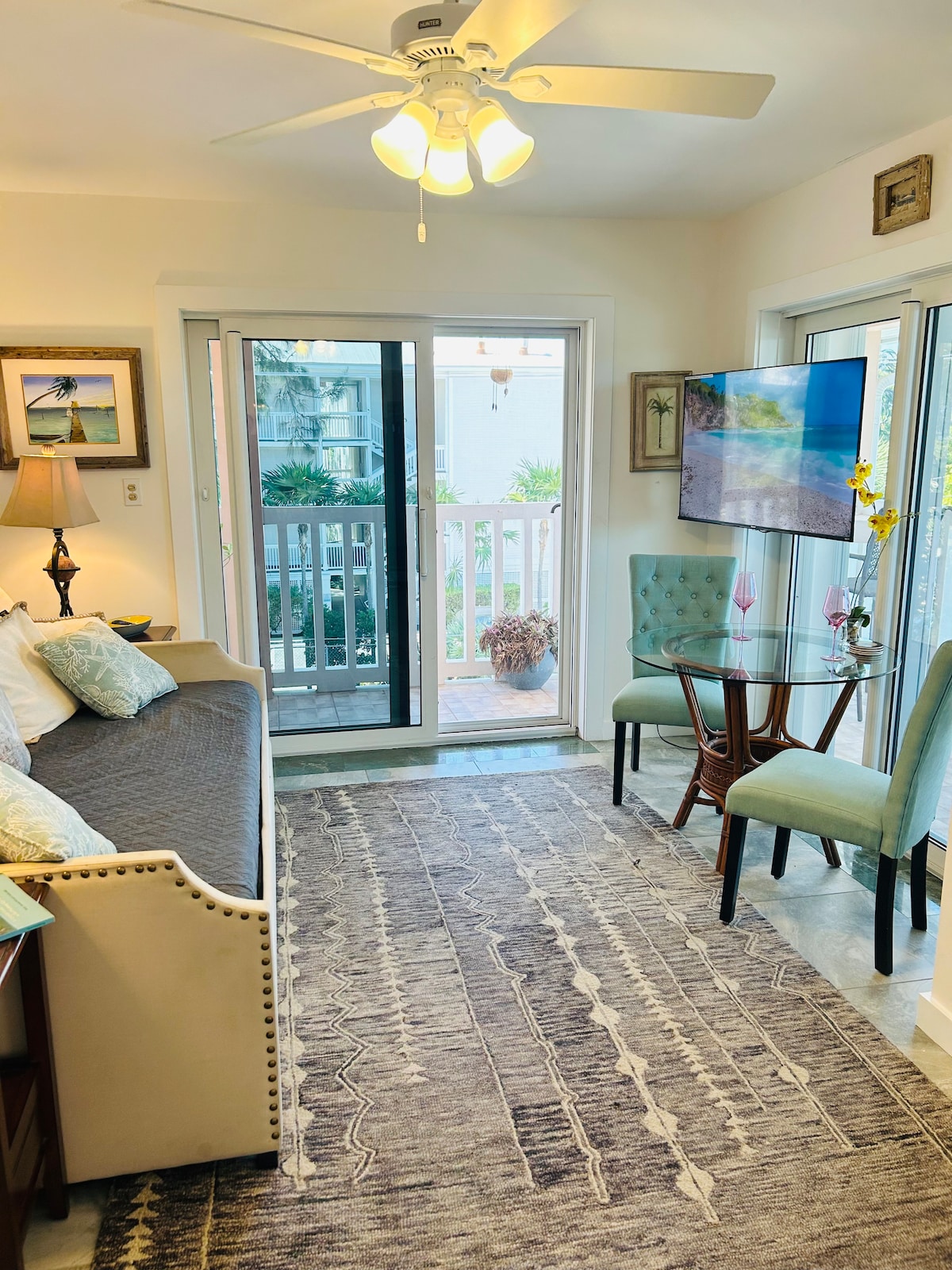 Apartamento actualizado frente al mar de 2 dormitorios/2 baños con cama tamaño king, cama tamaño queen y sofá cama. 35' de rompeolas, ¡trae tu barco! Disfrute de una cocina de cuarzo completamente surtida con electrodomésticos de acero inoxidable. Ubicado en Venture Out, un complejo cerrado tranquilo y familiar con pesca, langosta, piscinas, jacuzzi, pickleball, tenis, baloncesto, centro recreativo, bicicletas, kayaks y SUPs. Entre Key West (20 millas) y Marathon. WiFi gratuito; televisores Roku en ambos dormitorios y sala de estar. Kayaks, SUP y área de almacenamiento con refrigerador adicional y congelador de cebo.