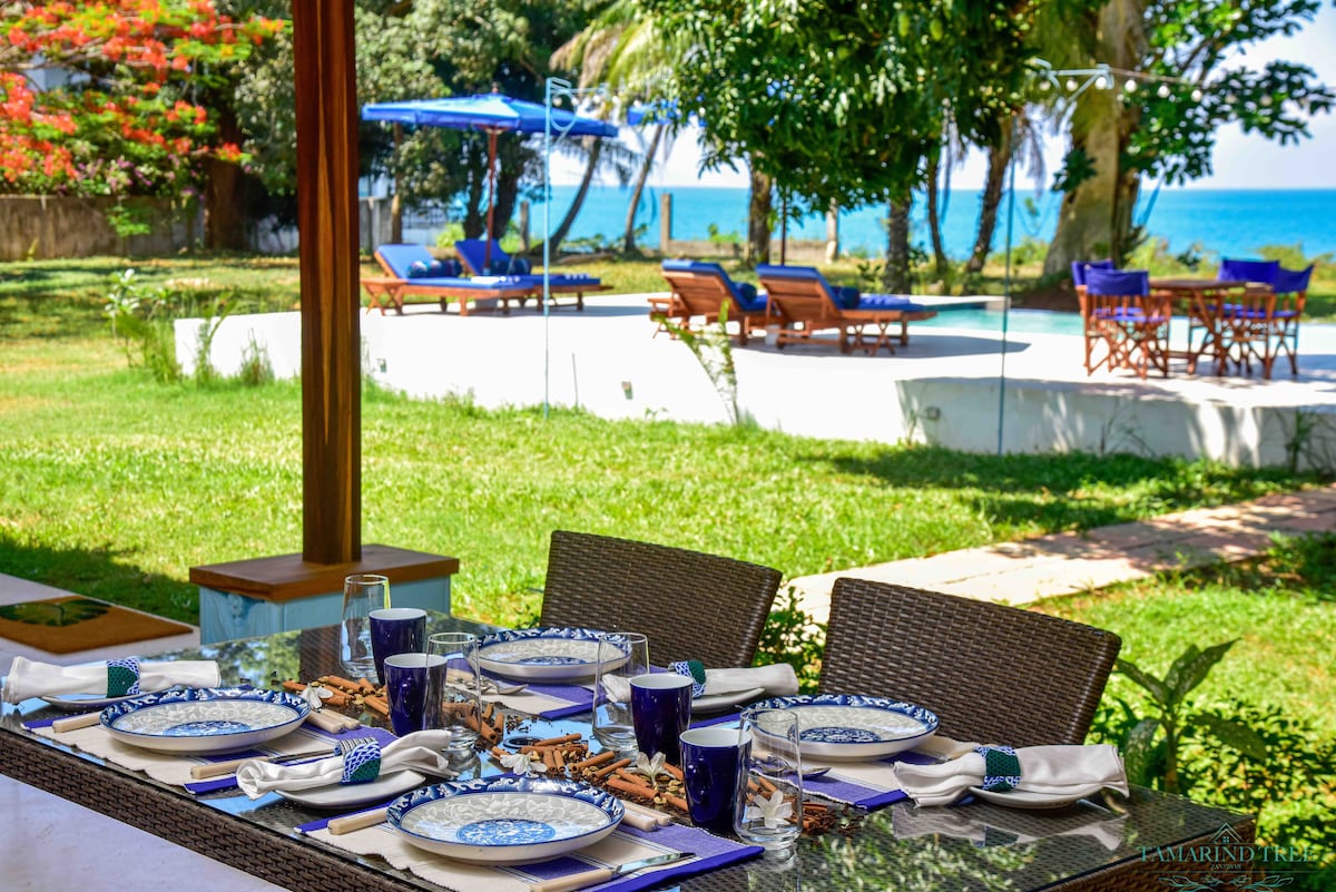 Relájate en esta propiedad de servicios tan tranquila y elegante y disfruta de las puestas de sol desde la espaciosa terraza con vistas al canal de Zanzíbar. La propiedad se encuentra en un gran jardín tropical en un acantilado con una playa durante las mareas bajas y altas. Tamarind Tree tiene personal de limpieza y un chef a tu disposición.