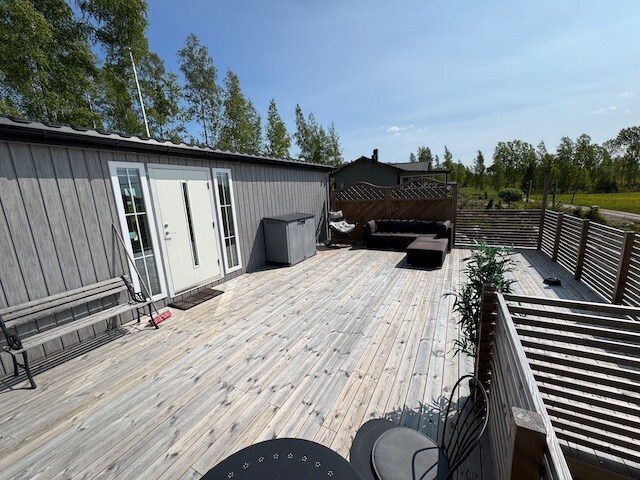 Esta casa de verano se encuentra en la hermosa Värmland. Vive justo al lado del agua. Playa privada con su propio muelle. Báñese desde la pequeña o el muelle. Puedes tomar prestado el bote de remos, pescar y disfrutar de la naturaleza. 90 metros cuadrados de una sola planta divididos en 2 dormitorios con camas de matrimonio con puerta de patio. Porche acristalado. Sala de estar abierta recién pintada, ventanas del suelo al techo con chimenea. Cocina totalmente equipada, baño recién renovado con bañera de hierro fundido y ducha. Invernadero con muebles de exterior con parqué para la puesta de sol. Hay wifi con fibra.