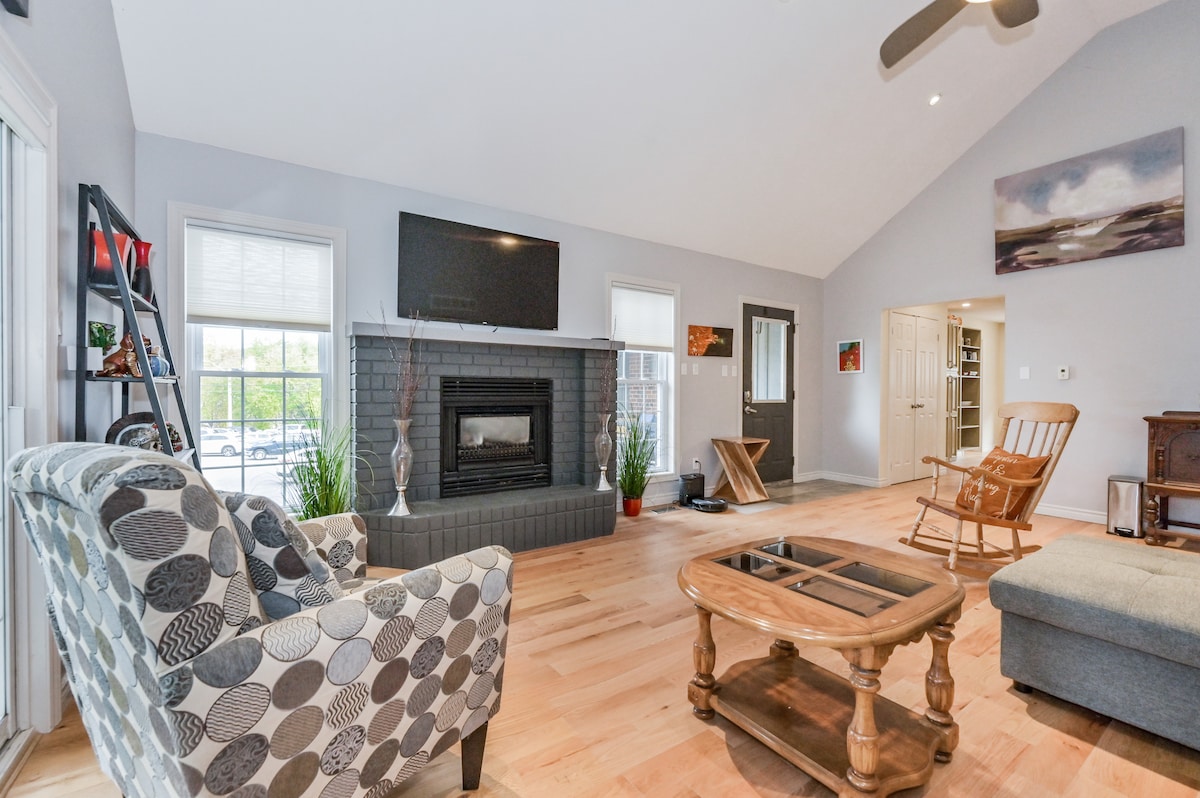Enjoy the view from this unique and tranquil getaway. Separate upper apartment with private entrance in quiet residential area. Secluded, park-like setting close to Masonville Mall, Western University and University Hospital. Indoor gas fireplace and sectional with sofa-bed in living room. Full kitchen and separate bedroom with queen bed. Free parking and high speed wi-fi internet.